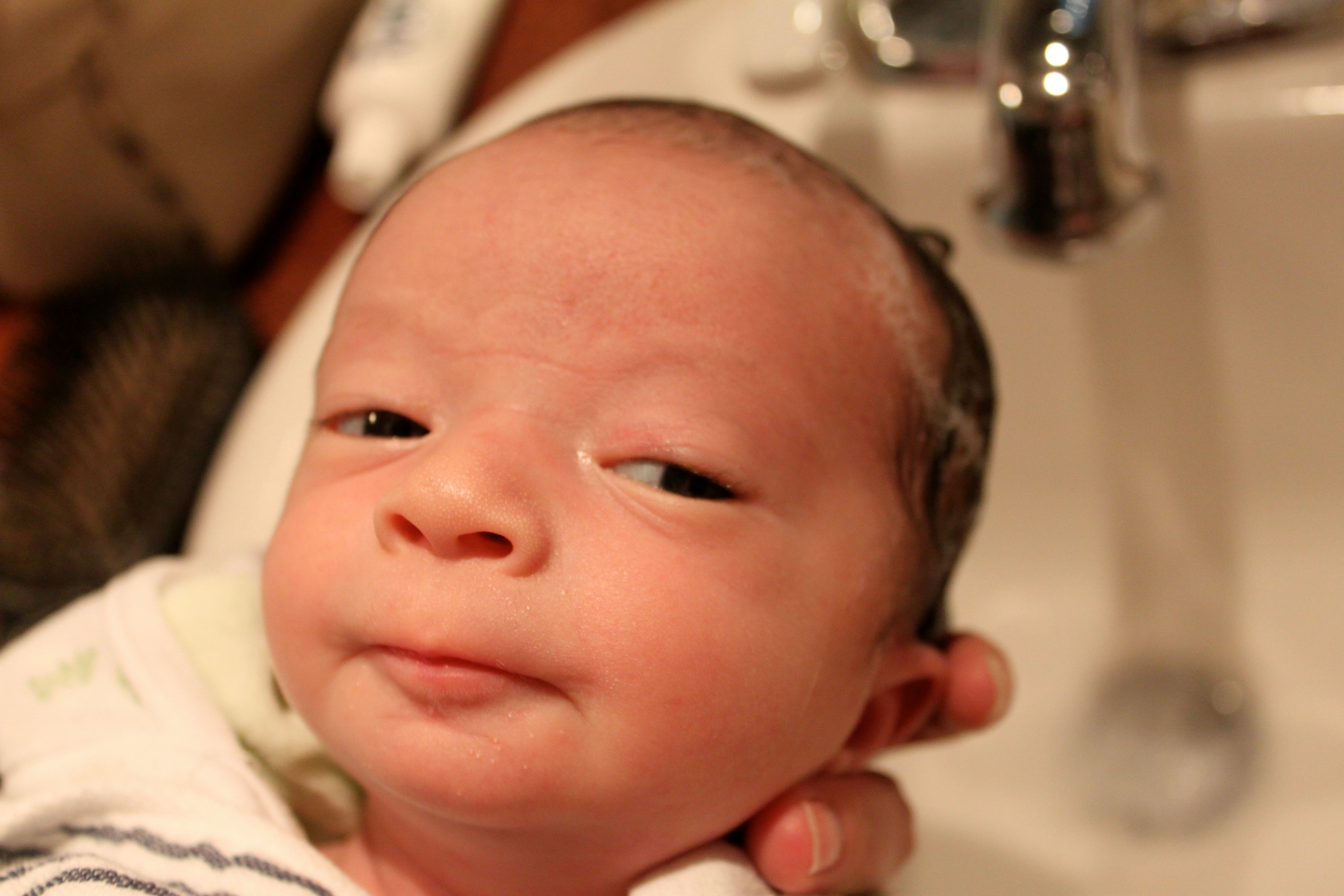 The delivery was quite the ordeal: The mom's water broke before she got to the hospital, and she didn't have time for an epidural. She developed preeclampsia. They did an episiotomy and used forceps to pull the baby out.